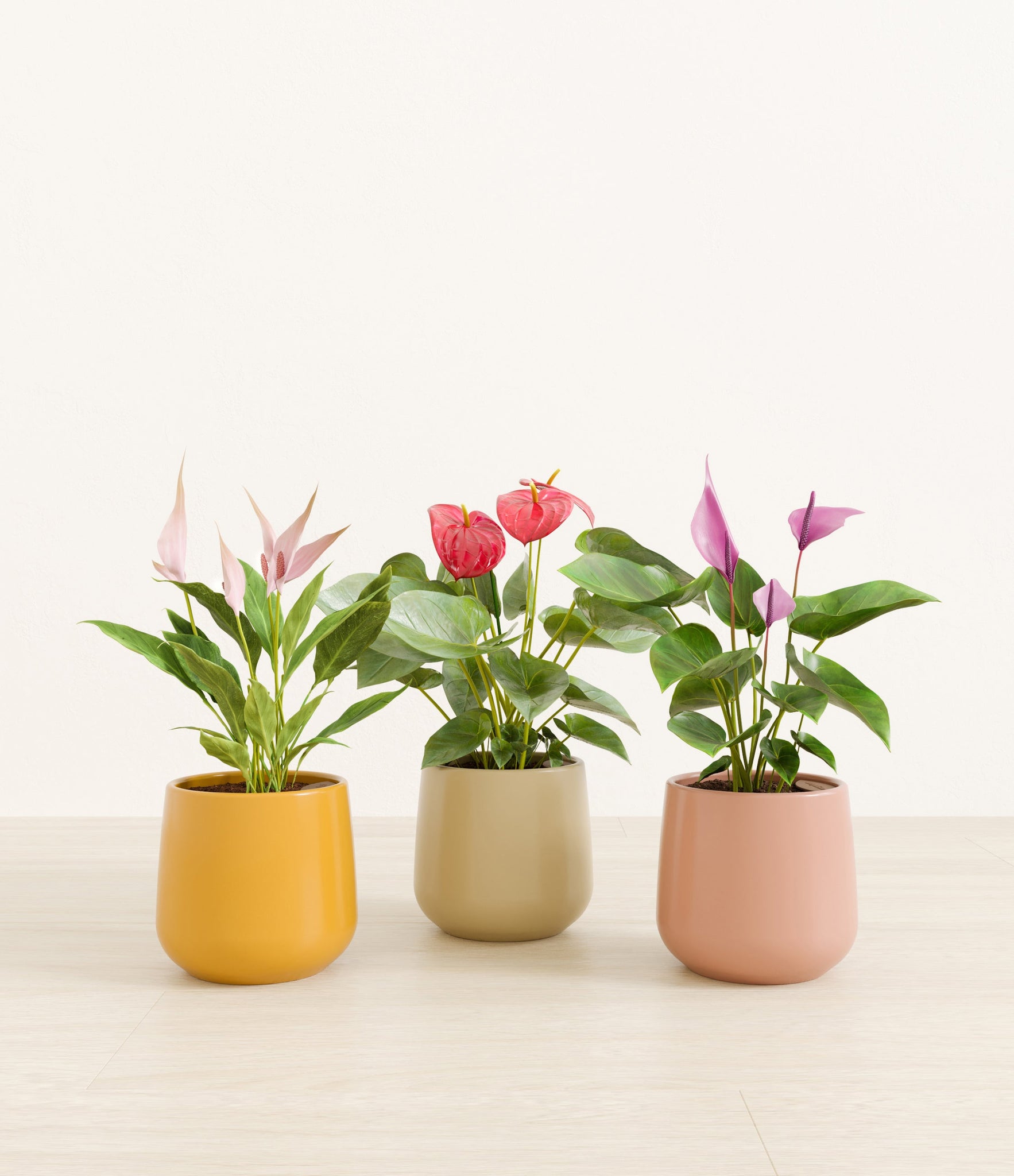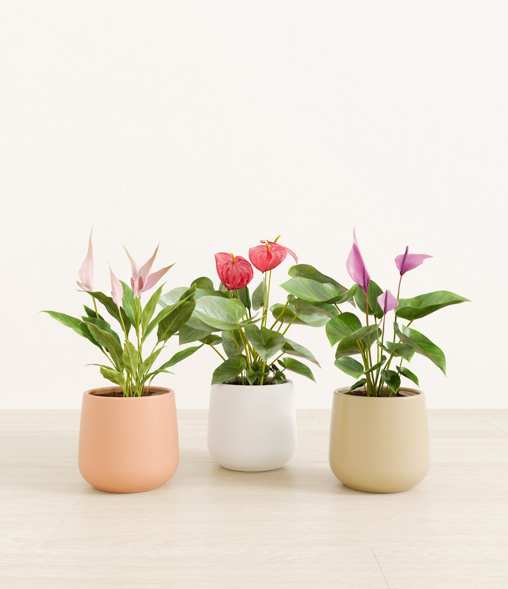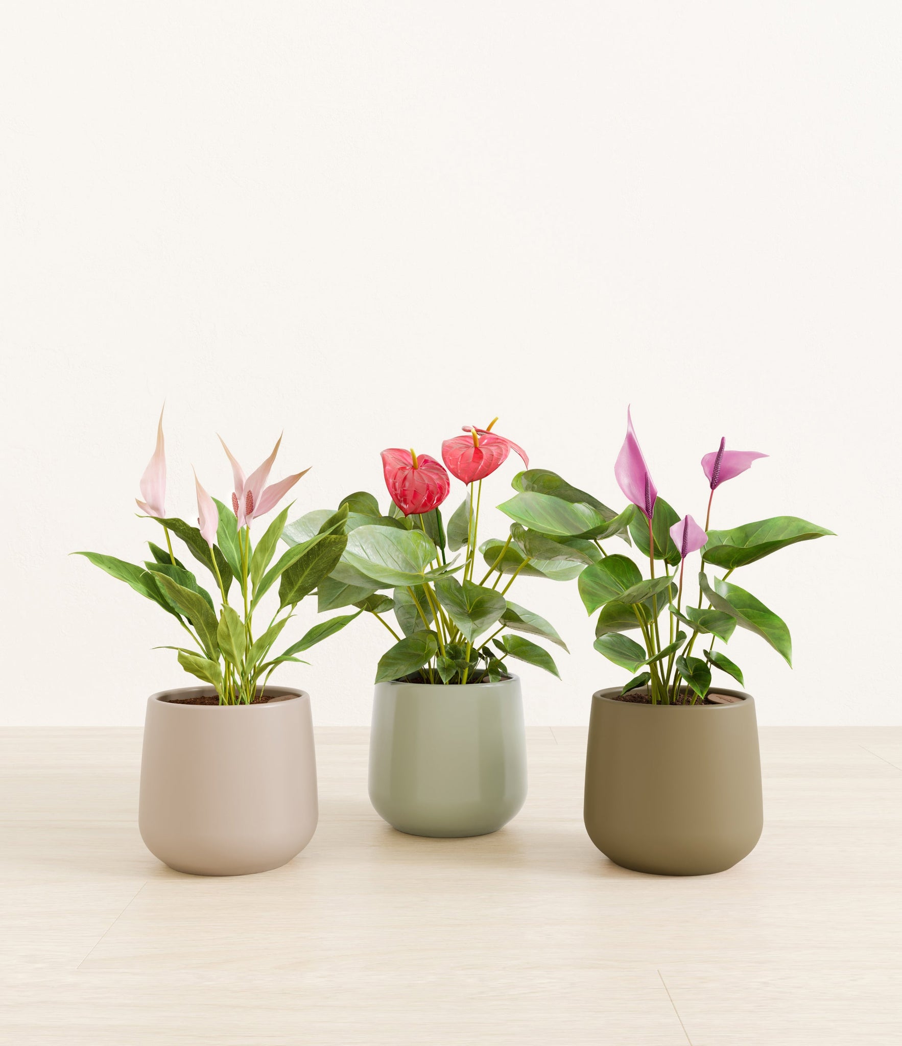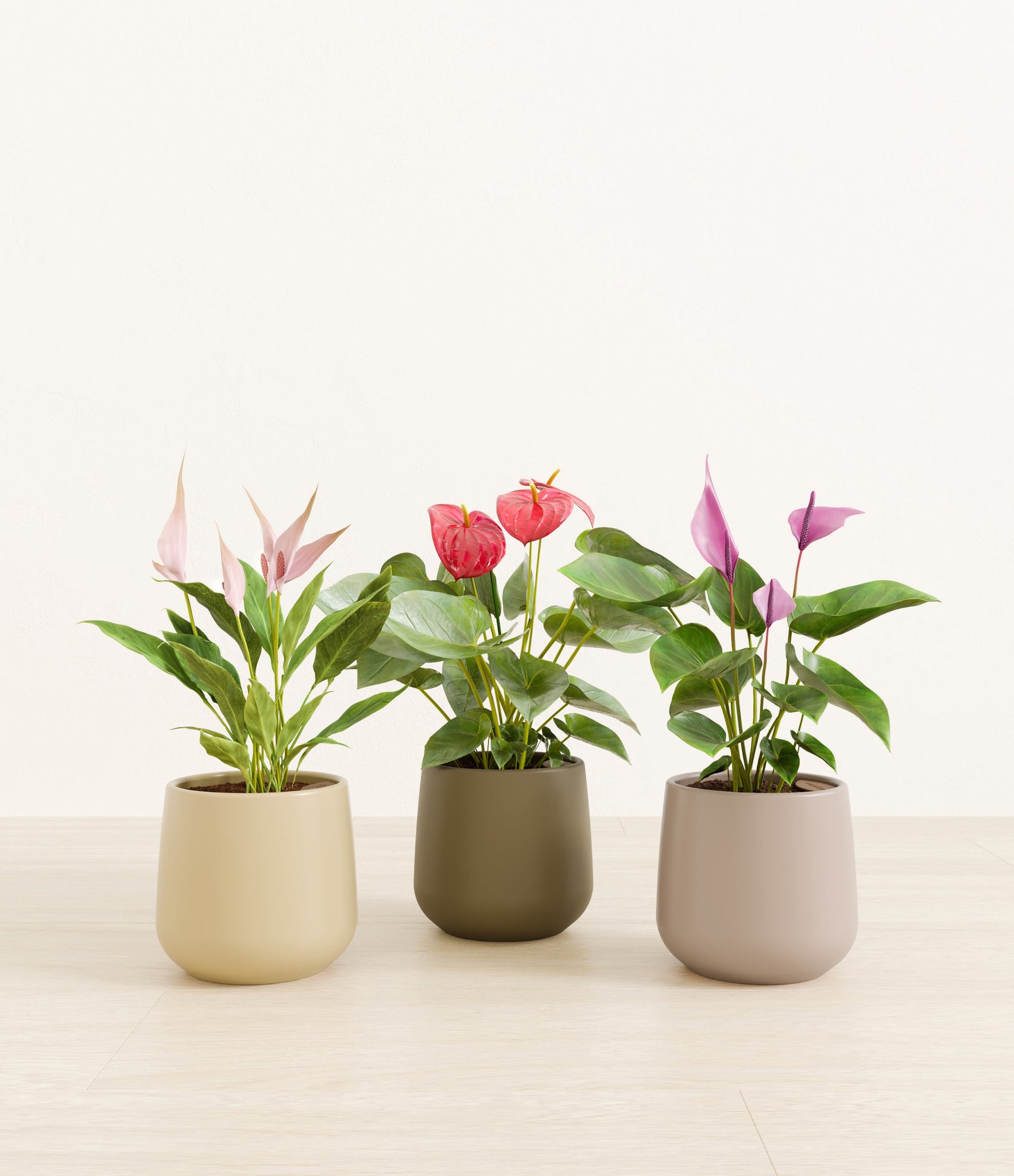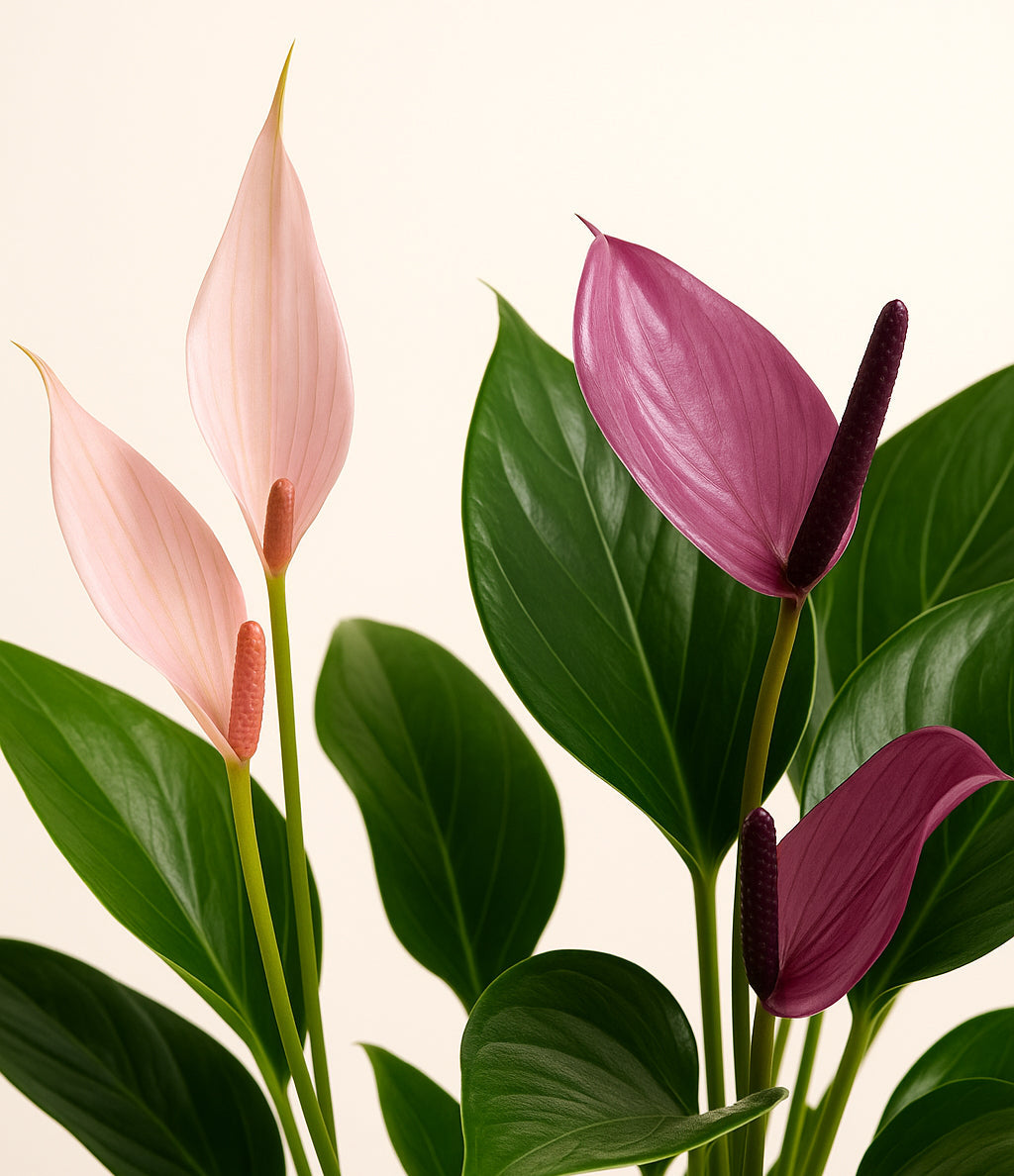 In this collection, you’ll receive a vibrant trio of flowering houseplants that instantly brighten any space. The set includes a small Anthurium Red - a beloved classic, admired for its vivid, heart-shaped waxy leaves that symbolise generosity and joy; a small Anthurium Lilli, dressed in delicate pink spathes that whisper softness and affection; and a small Anthurium Zizou, with its rich violet hues and striking upright blooms. Together, these three create a radiant and harmonious display of colour, perfect for bringing life, charm, and a touch of romance into any room.