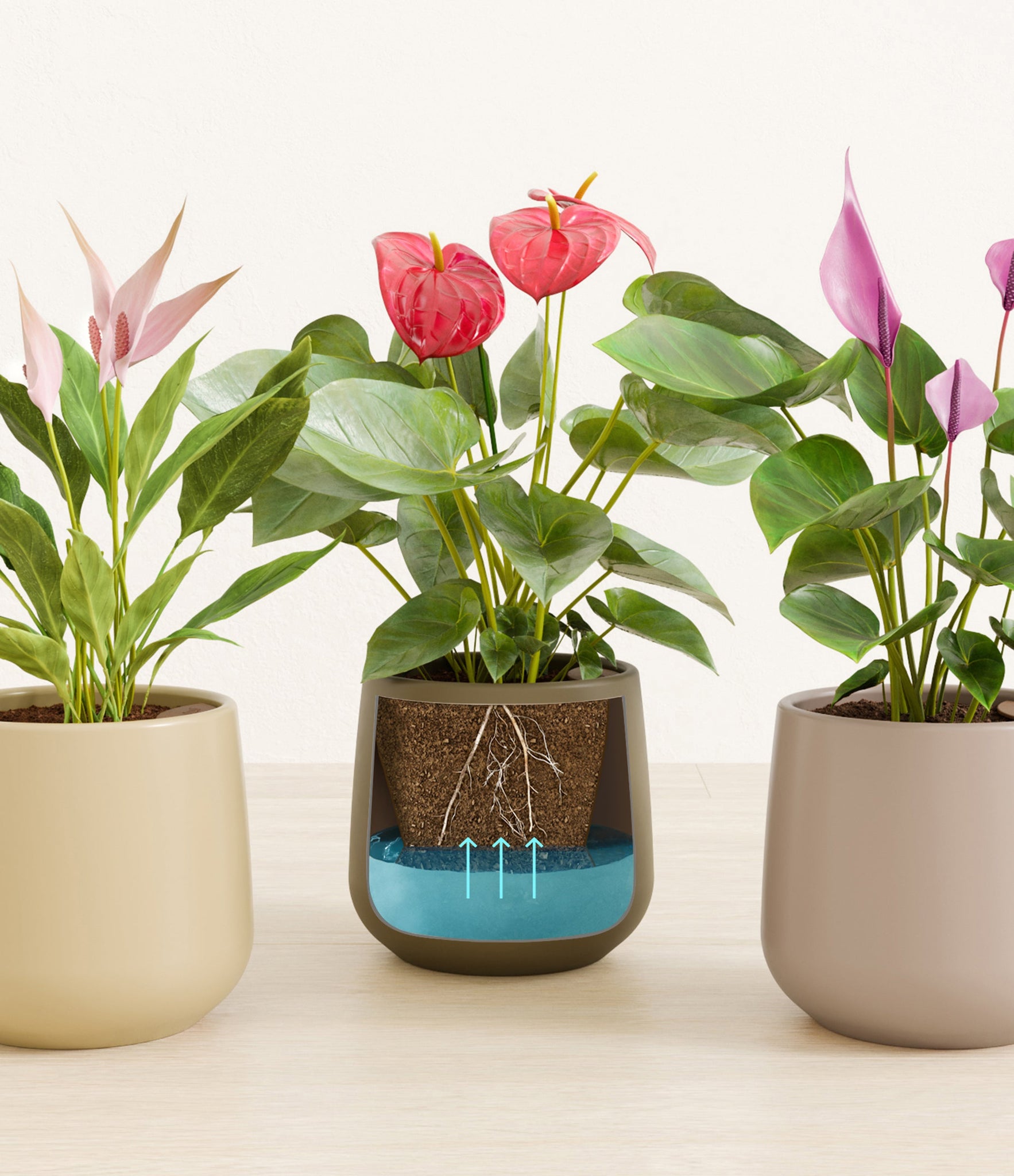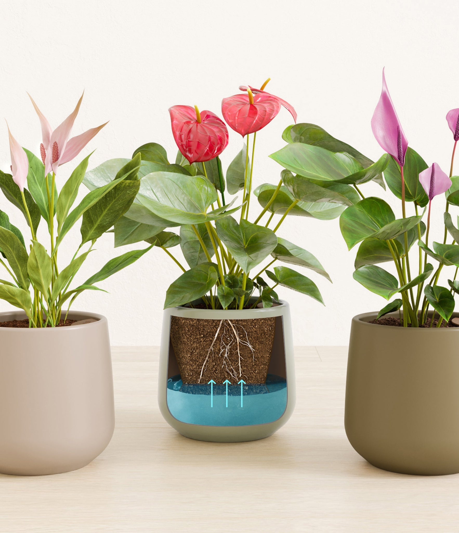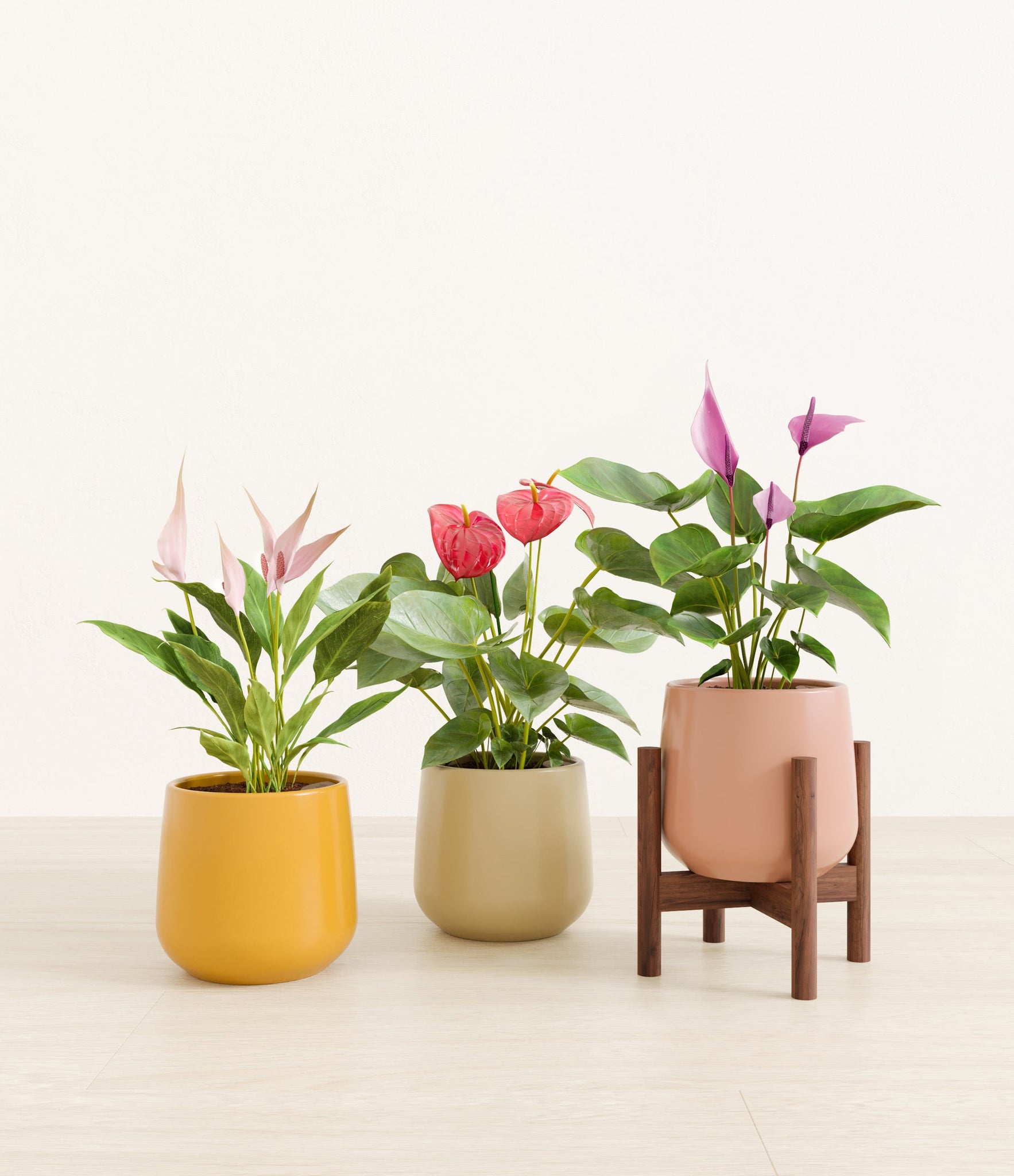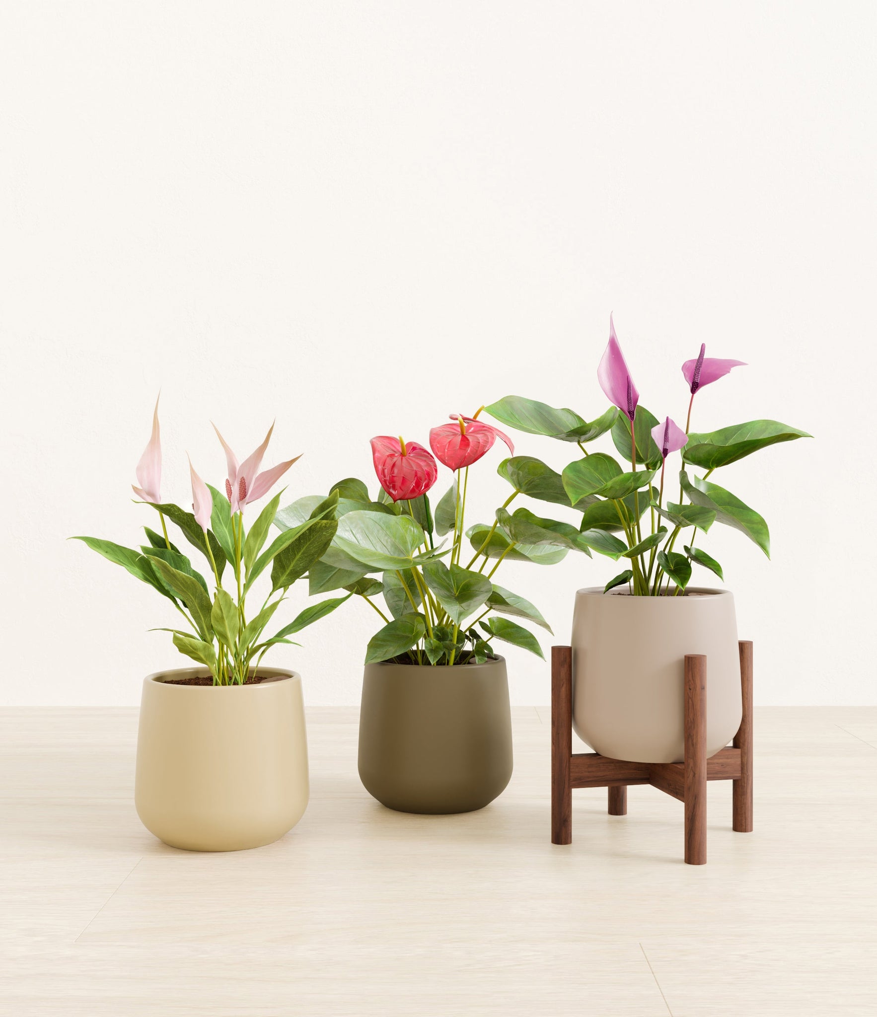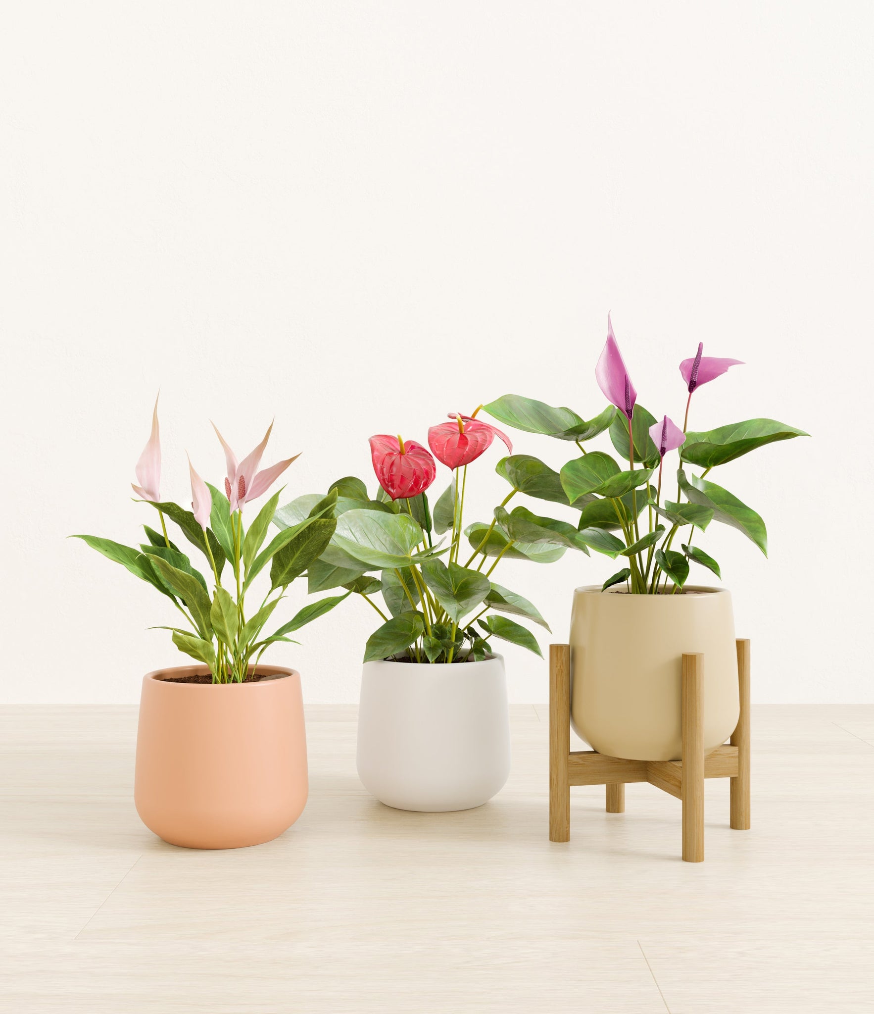 In this collection, you’ll receive a vibrant trio of flowering houseplants that instantly brighten any space. The set includes a small Anthurium Red - a beloved classic, admired for its vivid, heart-shaped waxy leaves that symbolise generosity and joy; a small Anthurium Lilli, dressed in delicate pink spathes that whisper softness and affection; and a small Anthurium Zizou, with its rich violet hues and striking upright blooms. Together, these three create a radiant and harmonious display of colour, perfect for bringing life, charm, and a touch of romance into any room.