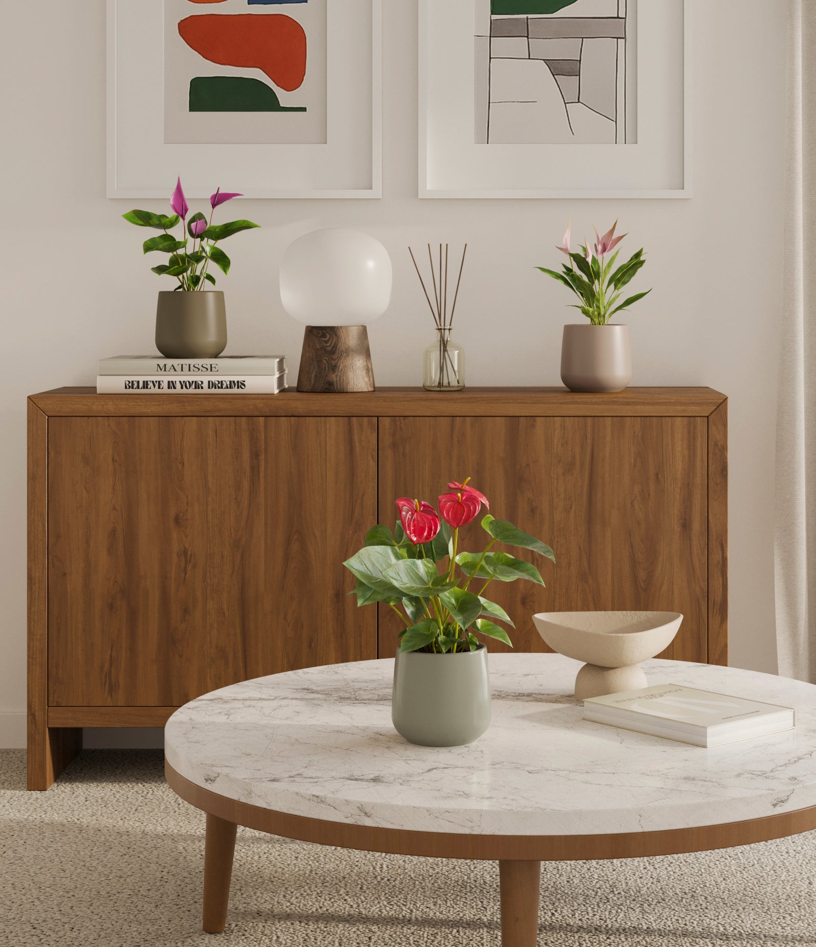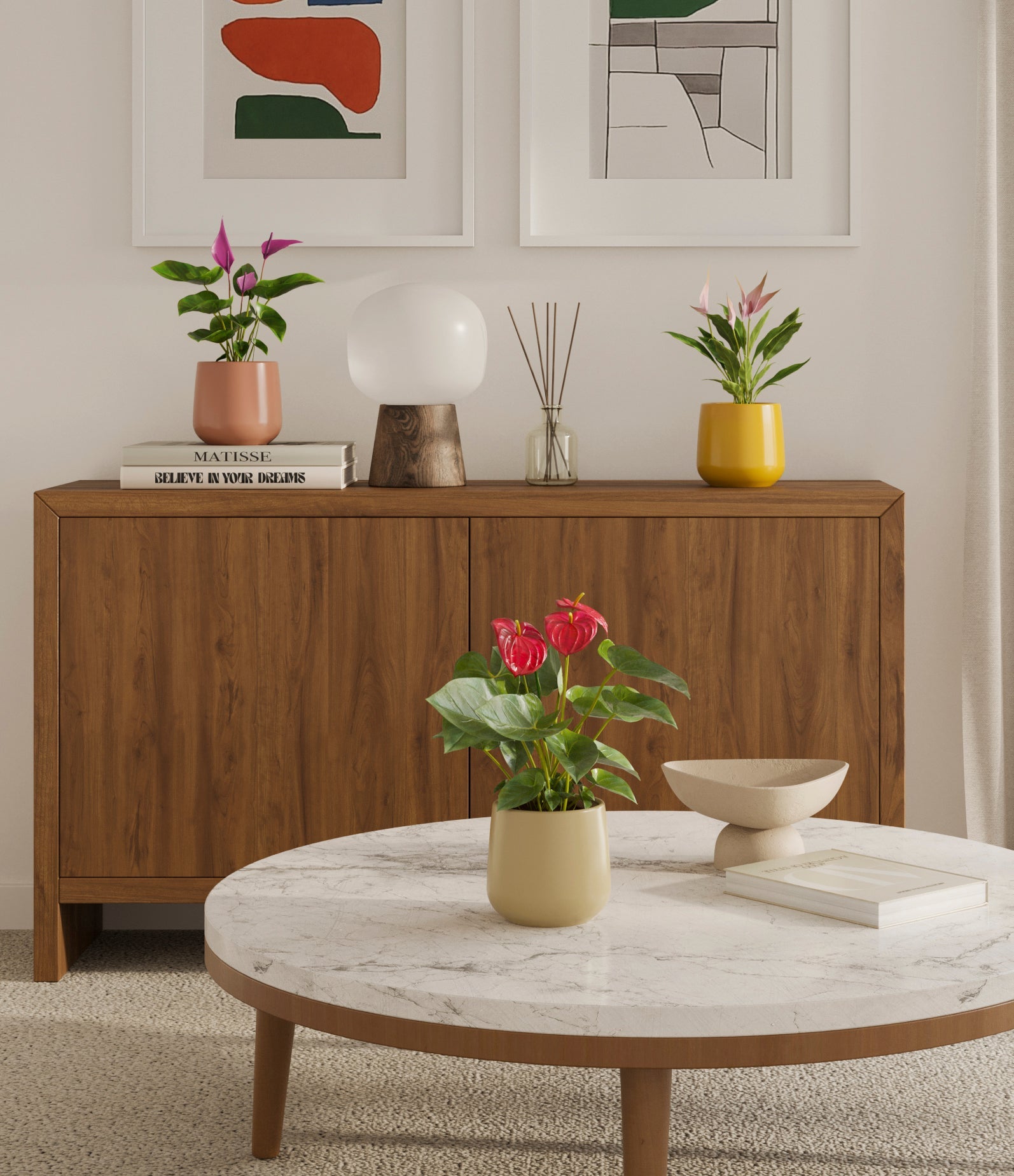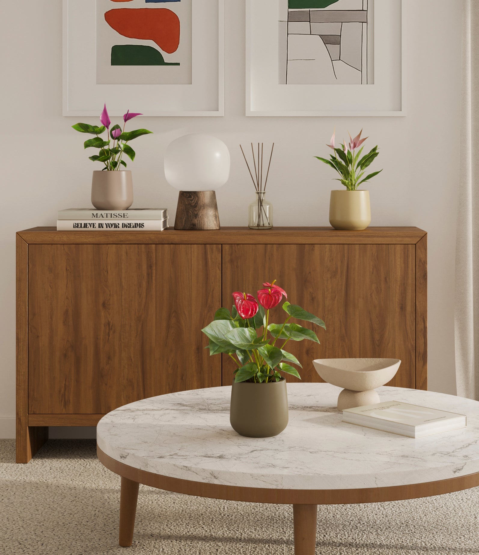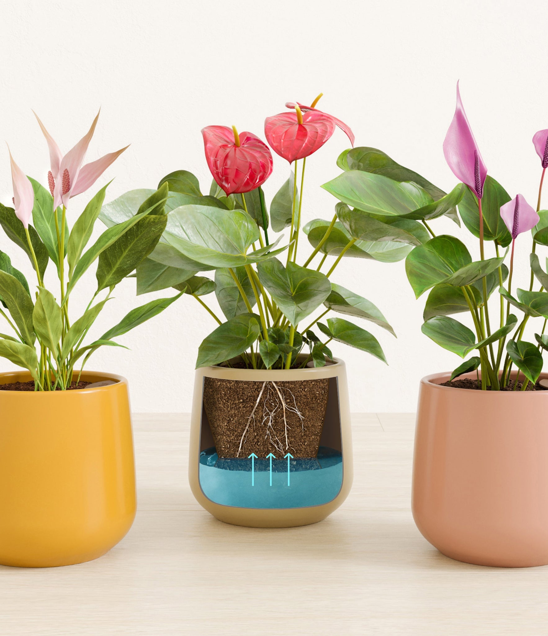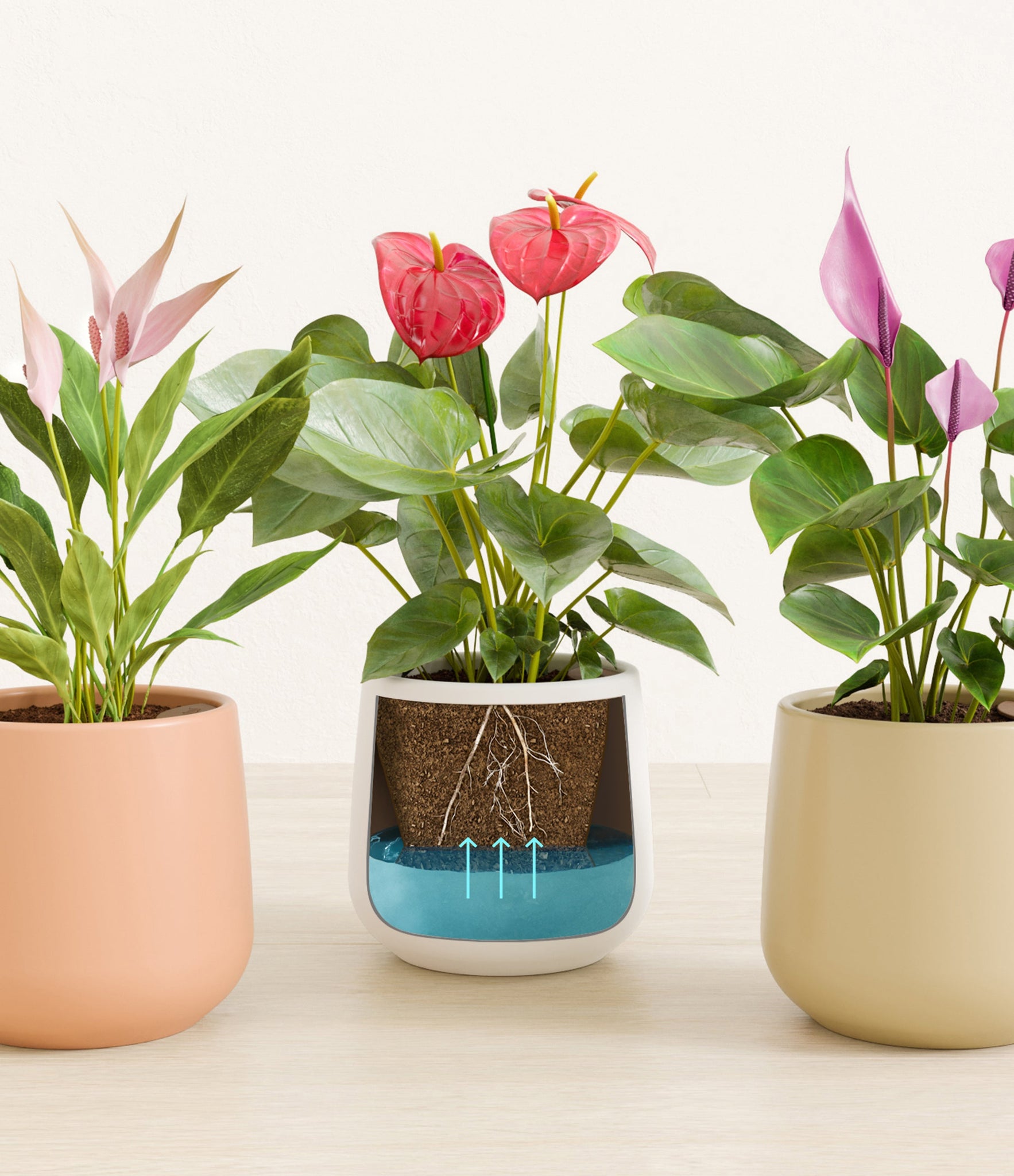 In this collection, you’ll receive a vibrant trio of flowering houseplants that instantly brighten any space. The set includes a small Anthurium Red - a beloved classic, admired for its vivid, heart-shaped waxy leaves that symbolise generosity and joy; a small Anthurium Lilli, dressed in delicate pink spathes that whisper softness and affection; and a small Anthurium Zizou, with its rich violet hues and striking upright blooms. Together, these three create a radiant and harmonious display of colour, perfect for bringing life, charm, and a touch of romance into any room.