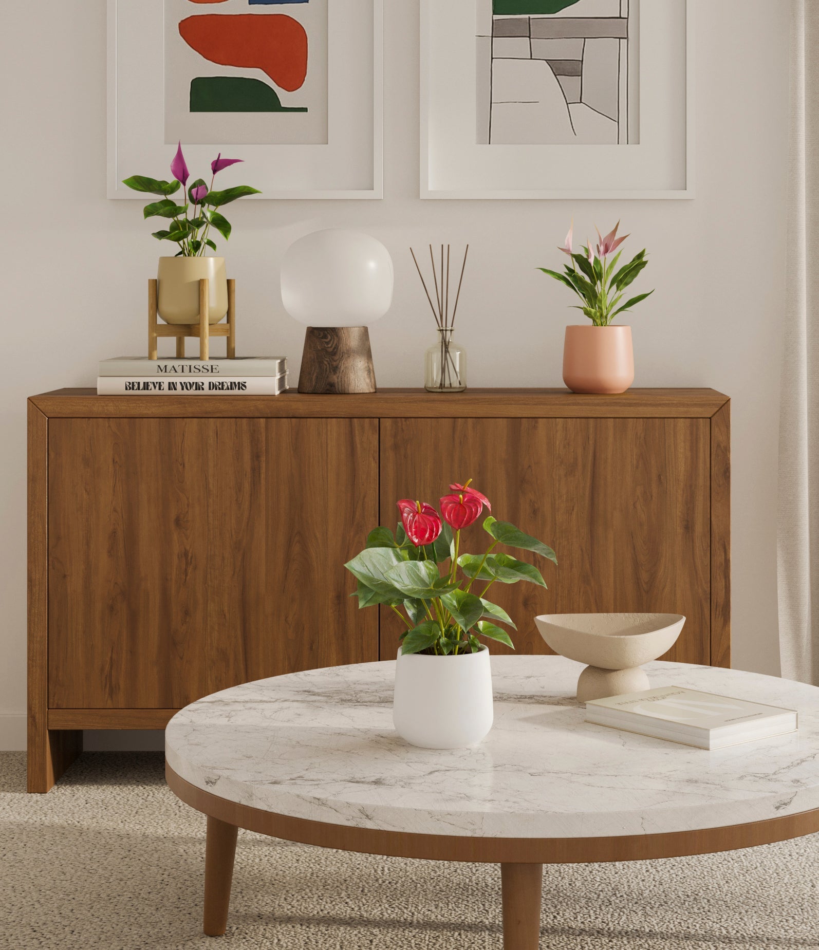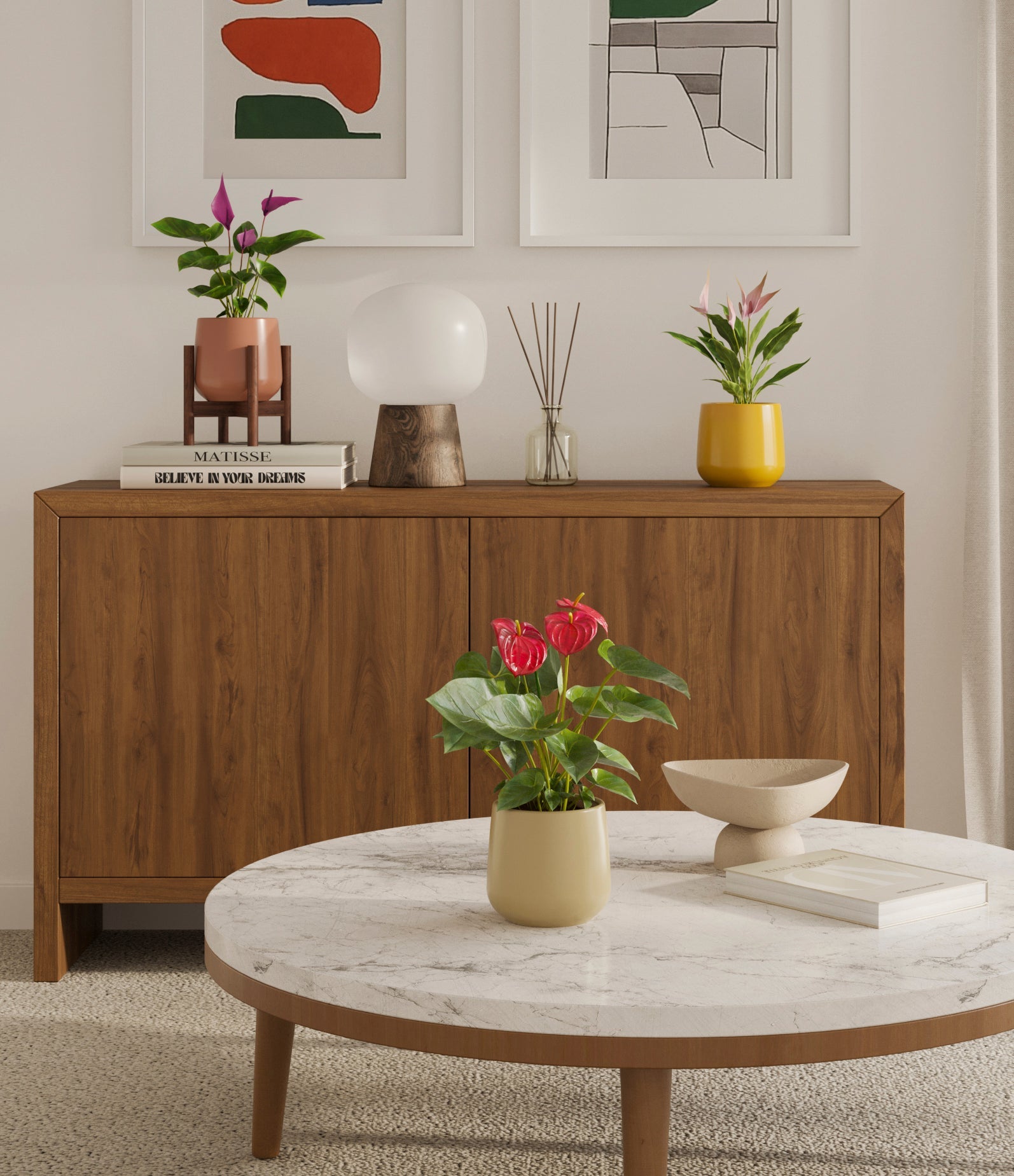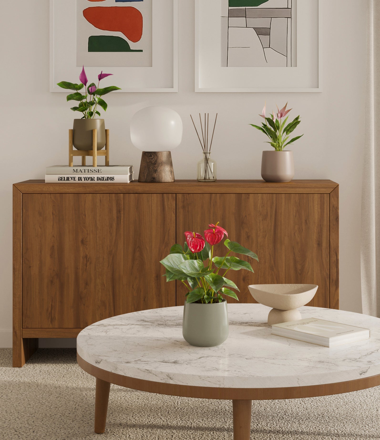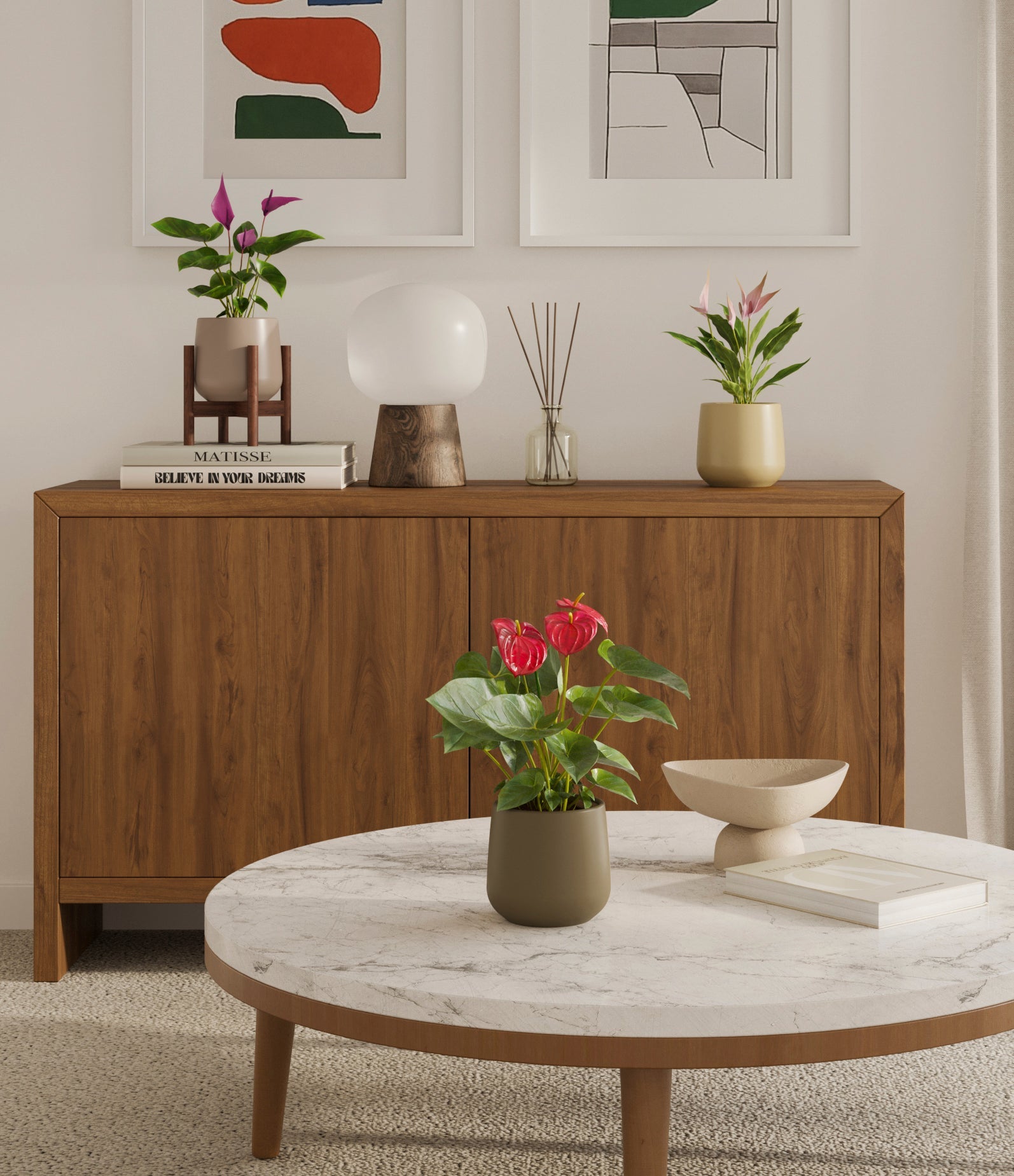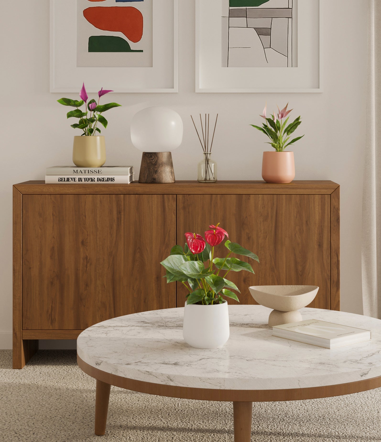 In this collection, you’ll receive a vibrant trio of flowering houseplants that instantly brighten any space. The set includes a small Anthurium Red - a beloved classic, admired for its vivid, heart-shaped waxy leaves that symbolise generosity and joy; a small Anthurium Lilli, dressed in delicate pink spathes that whisper softness and affection; and a small Anthurium Zizou, with its rich violet hues and striking upright blooms. Together, these three create a radiant and harmonious display of colour, perfect for bringing life, charm, and a touch of romance into any room.