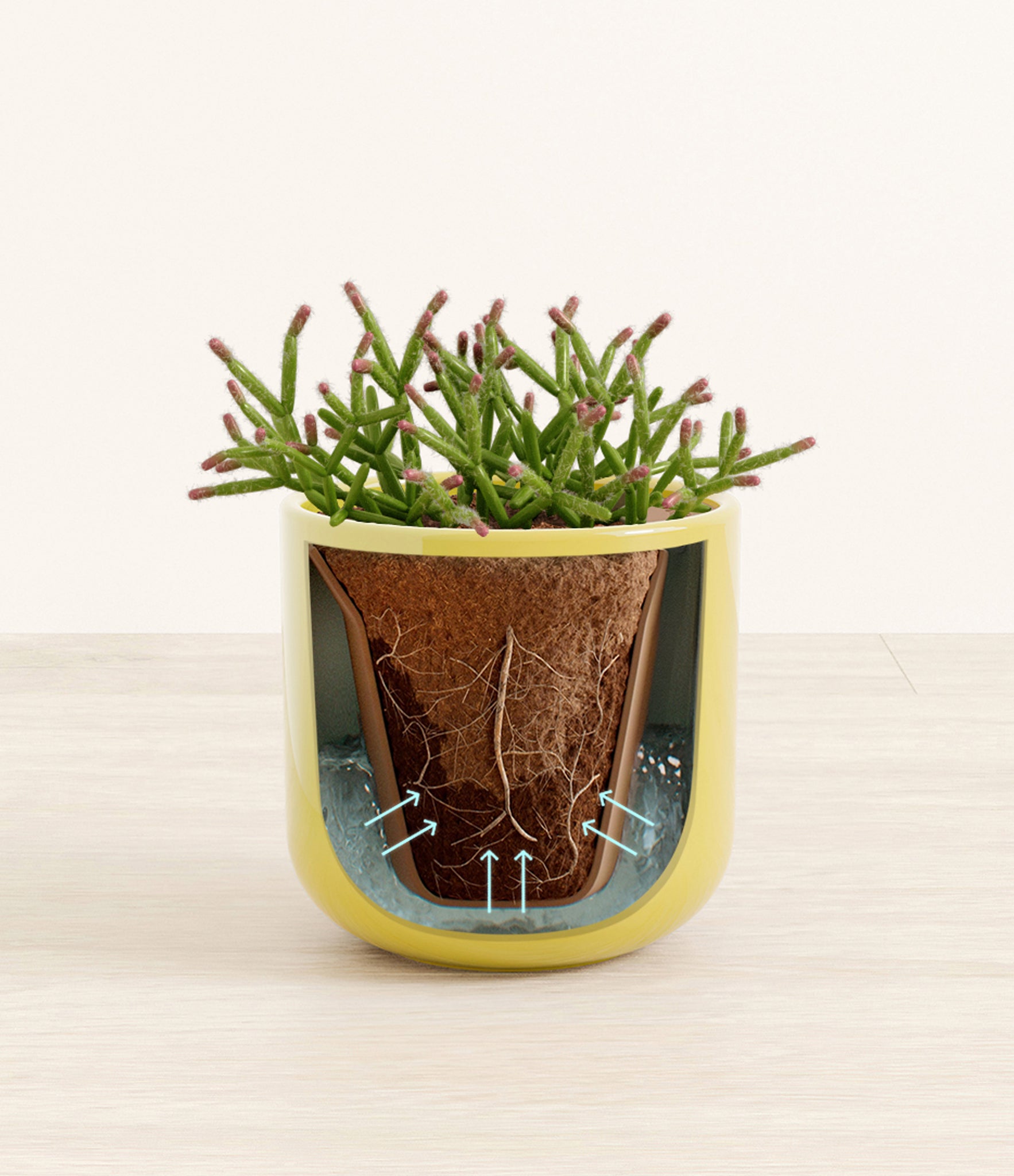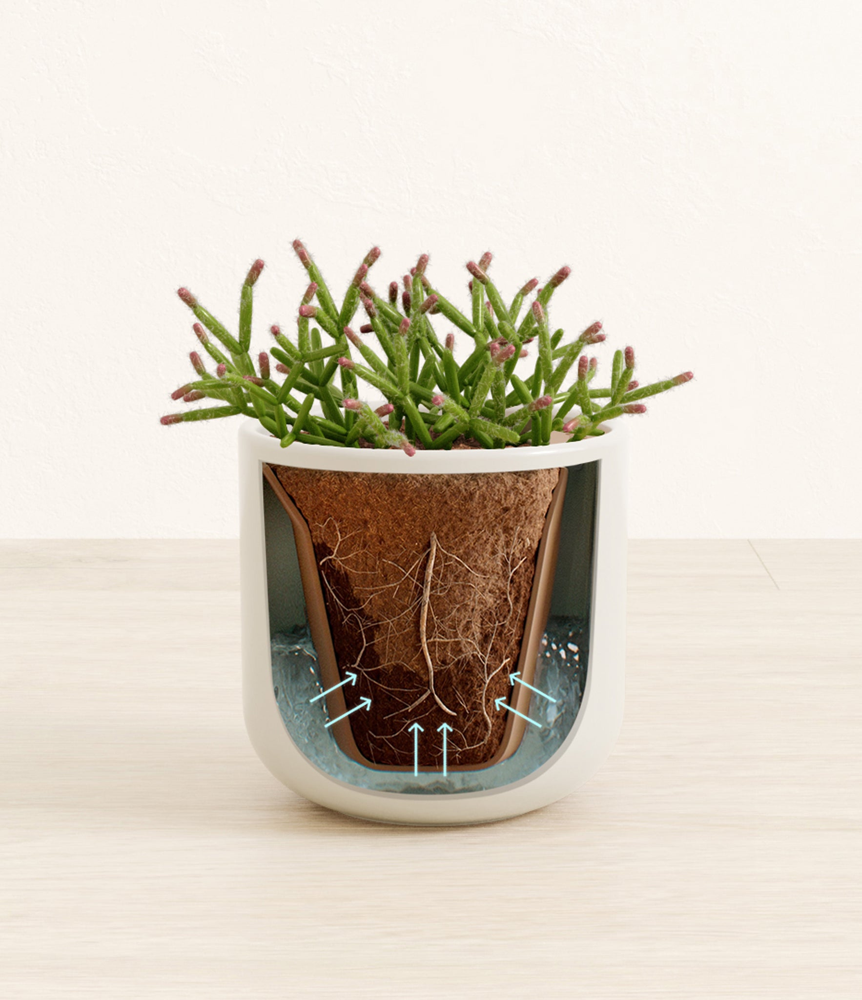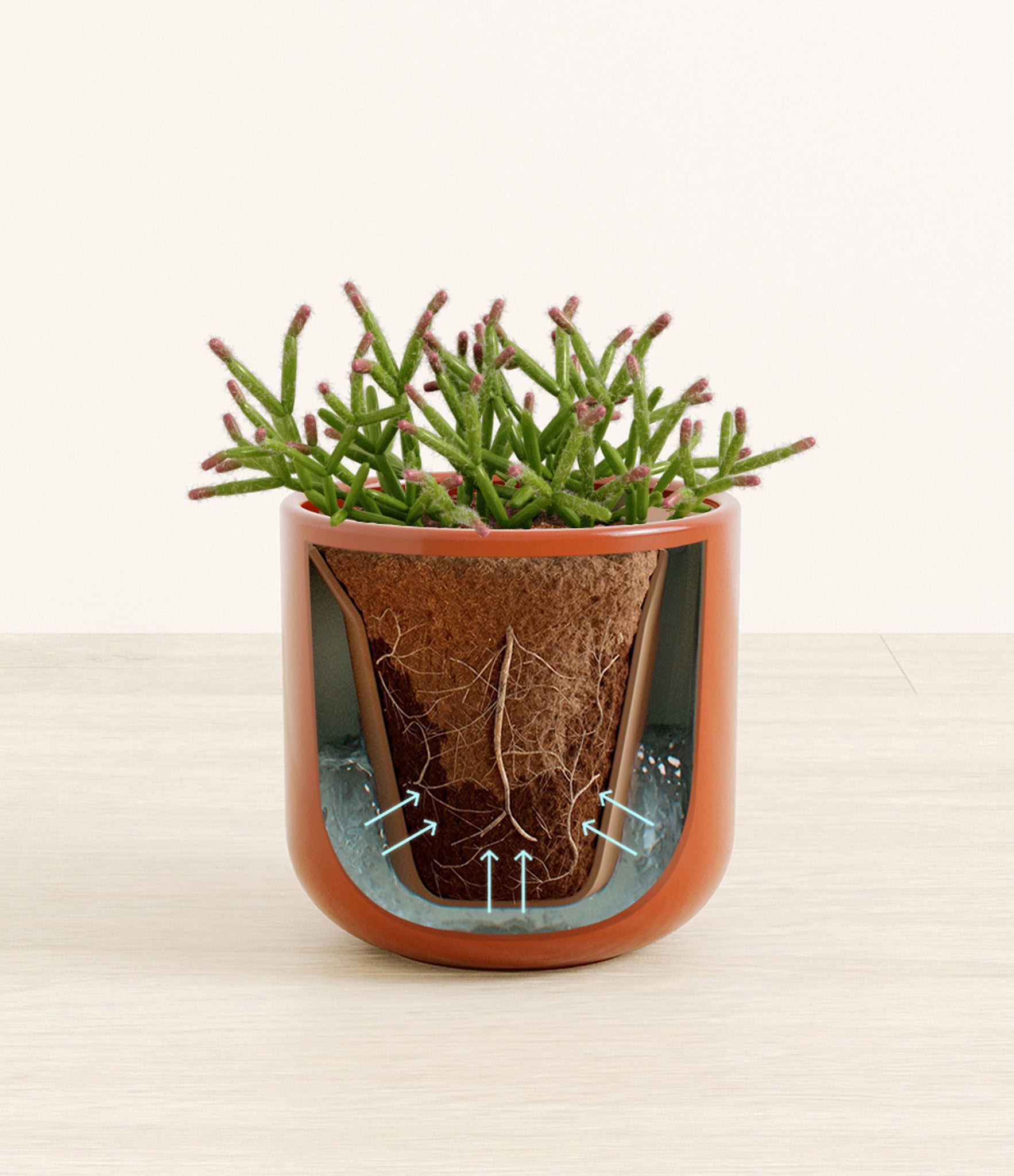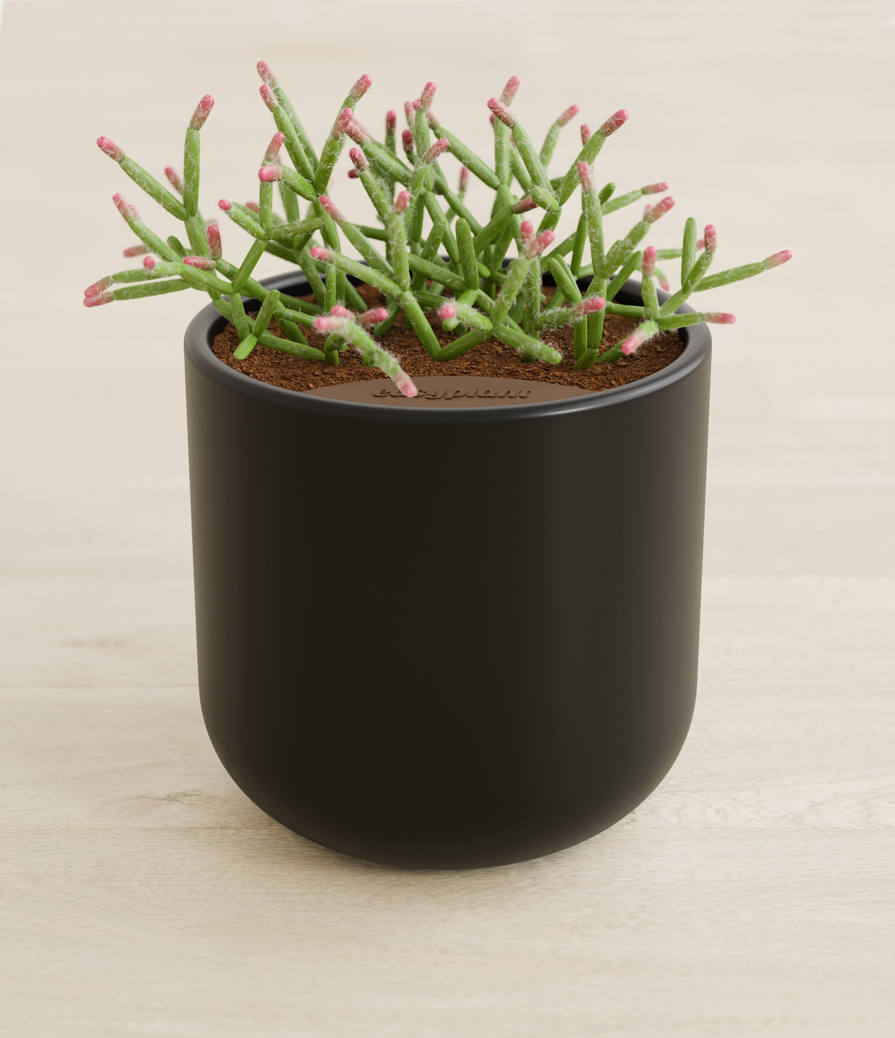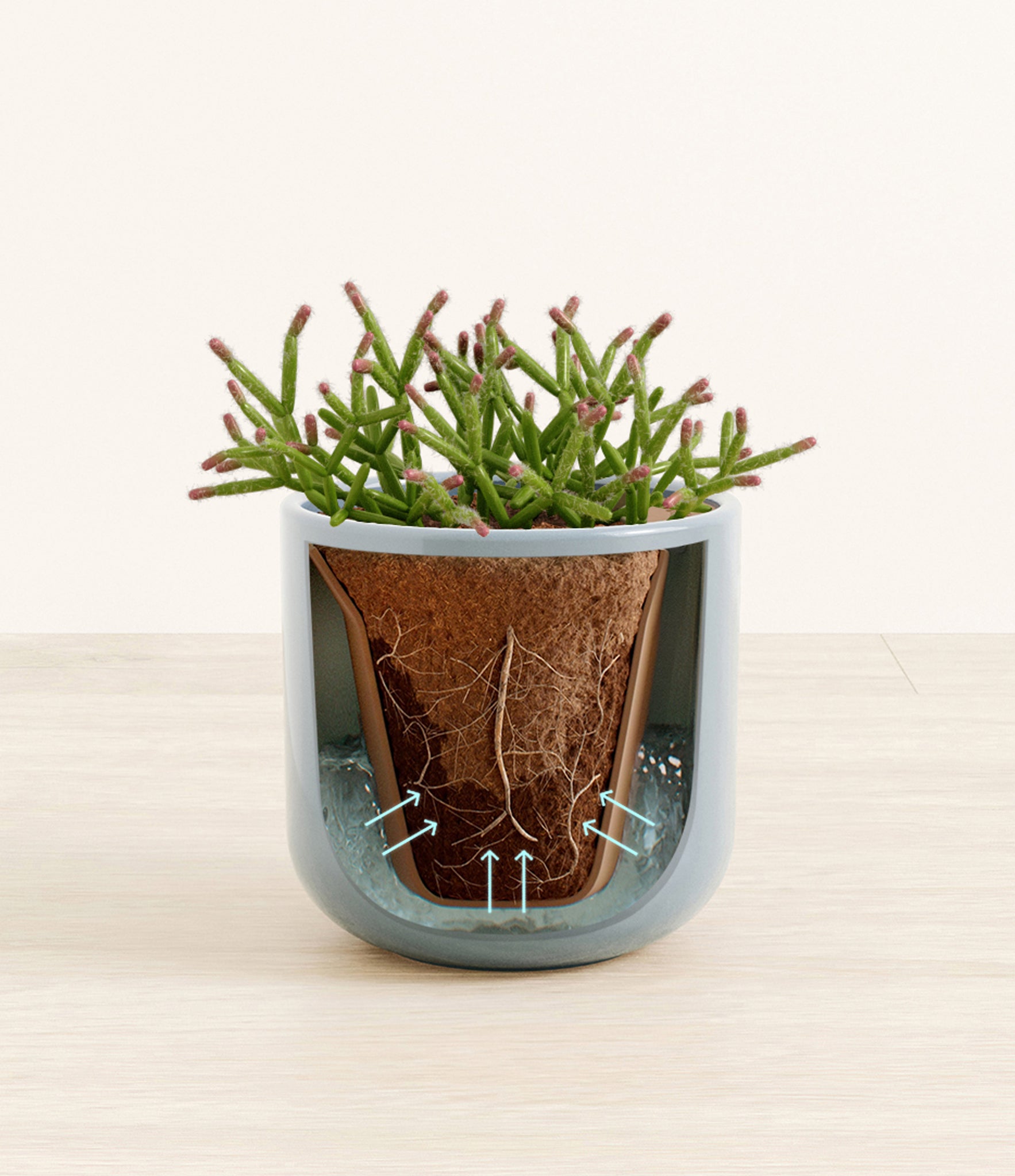 A magnificent plant with an extraordinary leaf structure, the Rhipsalis baccifera is admired for its bright green, pencil-thin foliage that trails effortlessly. Potted in a premium-quality self-watering pot with a soft matte finish, this exquisite plant can reach up to 1.8 metres indoors. Originating from South America, Central America, and Africa’s subtropical climates, the Rhipsalis baccifera thrives in humid environments so be sure to keep it somewhere cosy to make it feel at home.