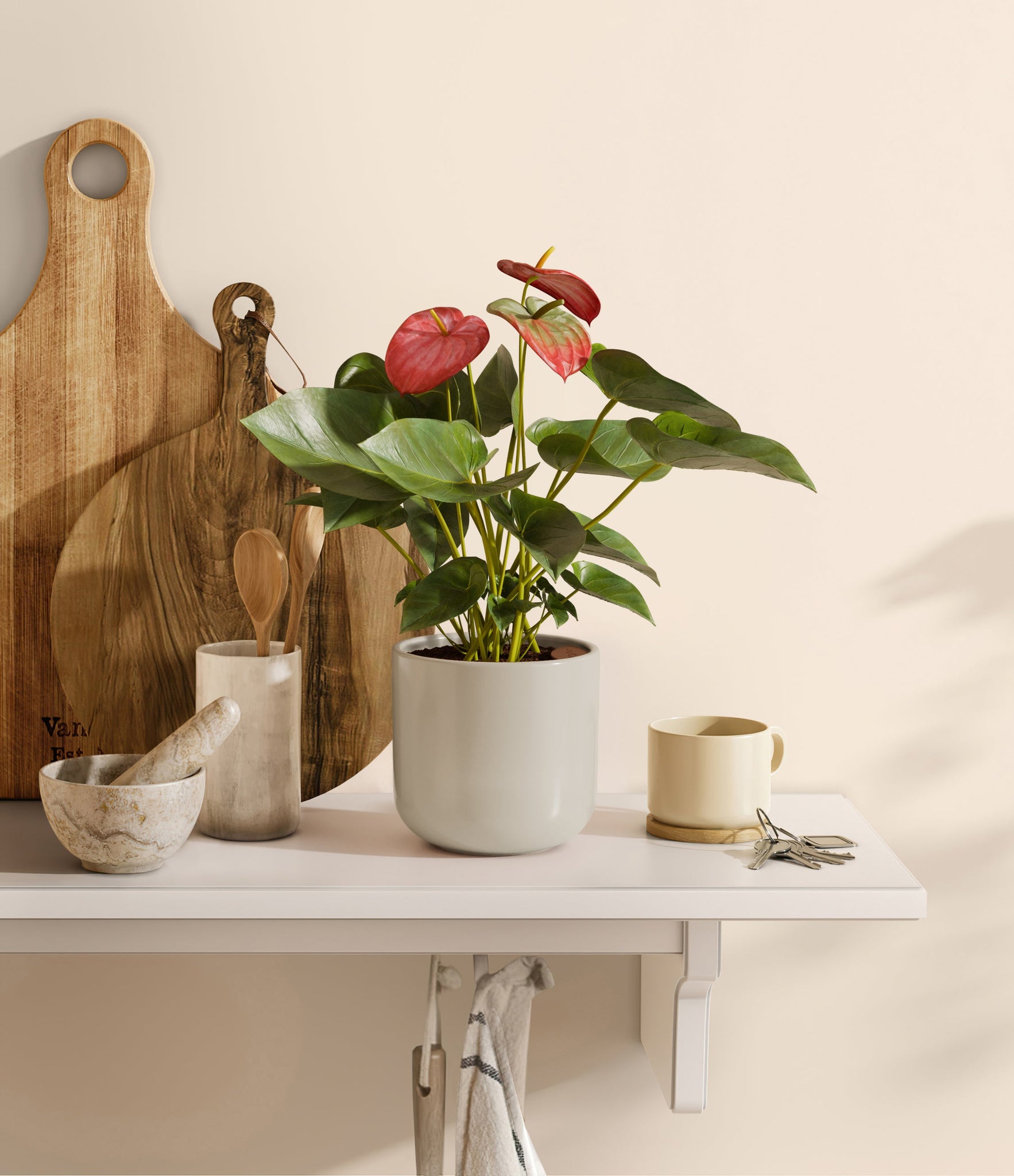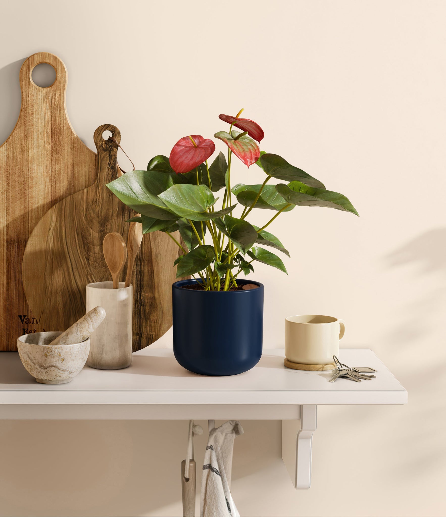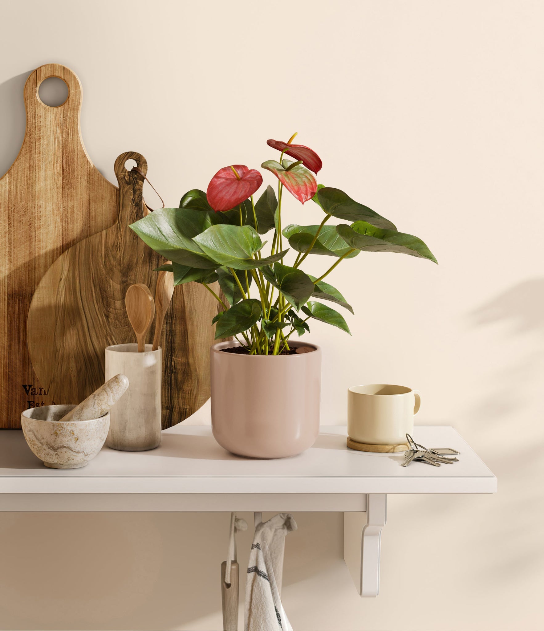 Native to the Americas and Caribbeans, this tropical evergreen beauty brings out the best and brightest in any space it inhabits. The colorful heart-shaped waxy leaves, called spathes, act as protectors for its straight spike, called spadix, where very small flowers grow in its bloom. As the plant matures, bloom colors may naturally vary or evolve, reflecting its dynamic beauty. Thanks to its long-lived, heart-opening charm, Anthurium is the quintessential symbol of generosity and kindness, making it a perfect gift for those you love the most. It is cherished for its long blooms, lasting anywhere from eight to twelve weeks.