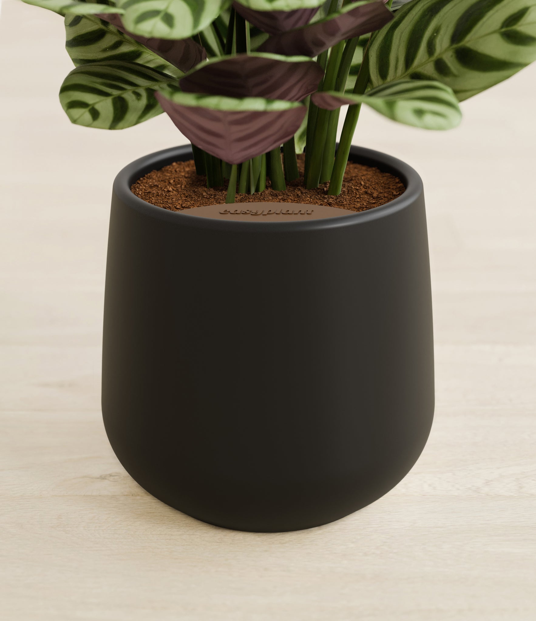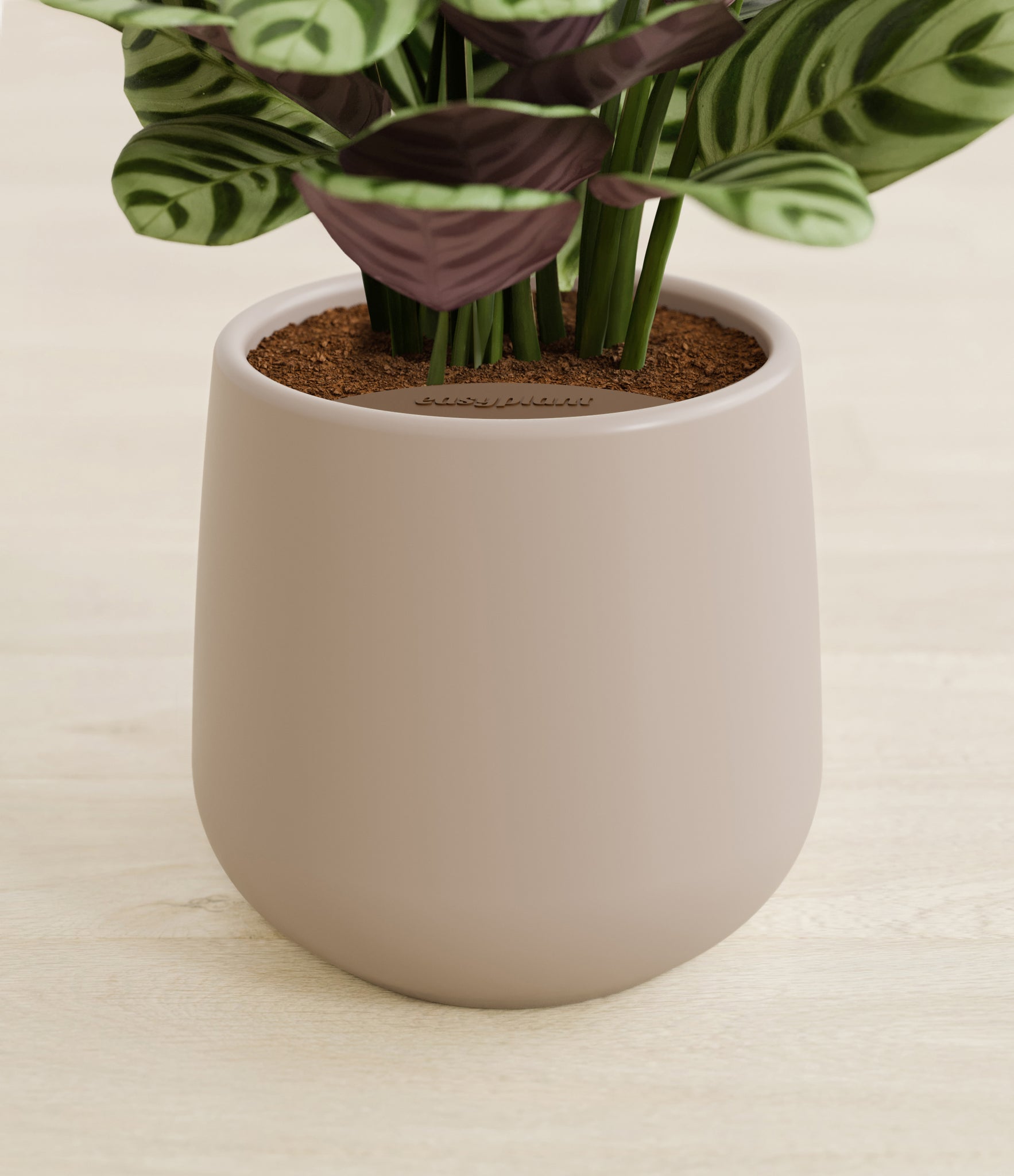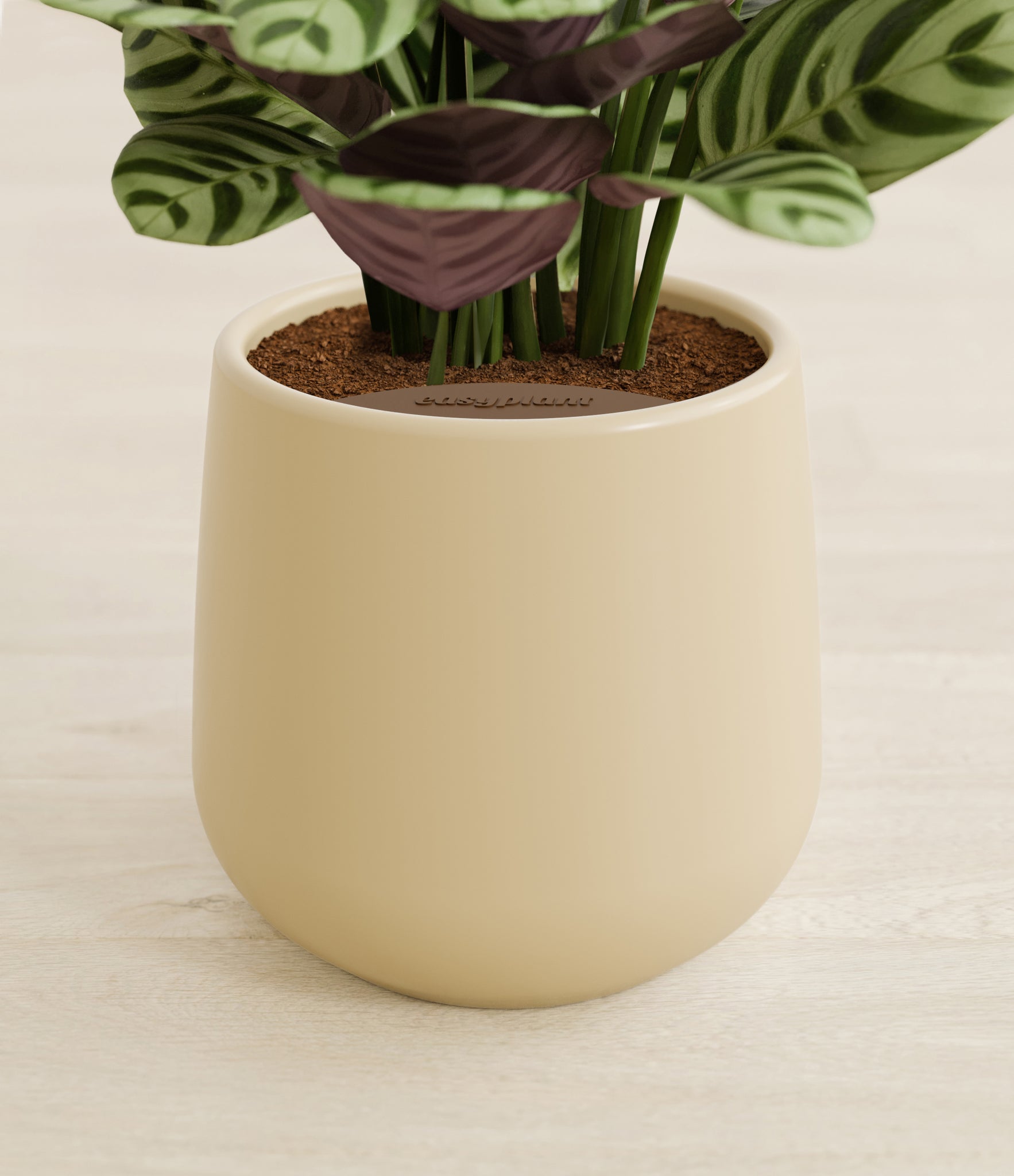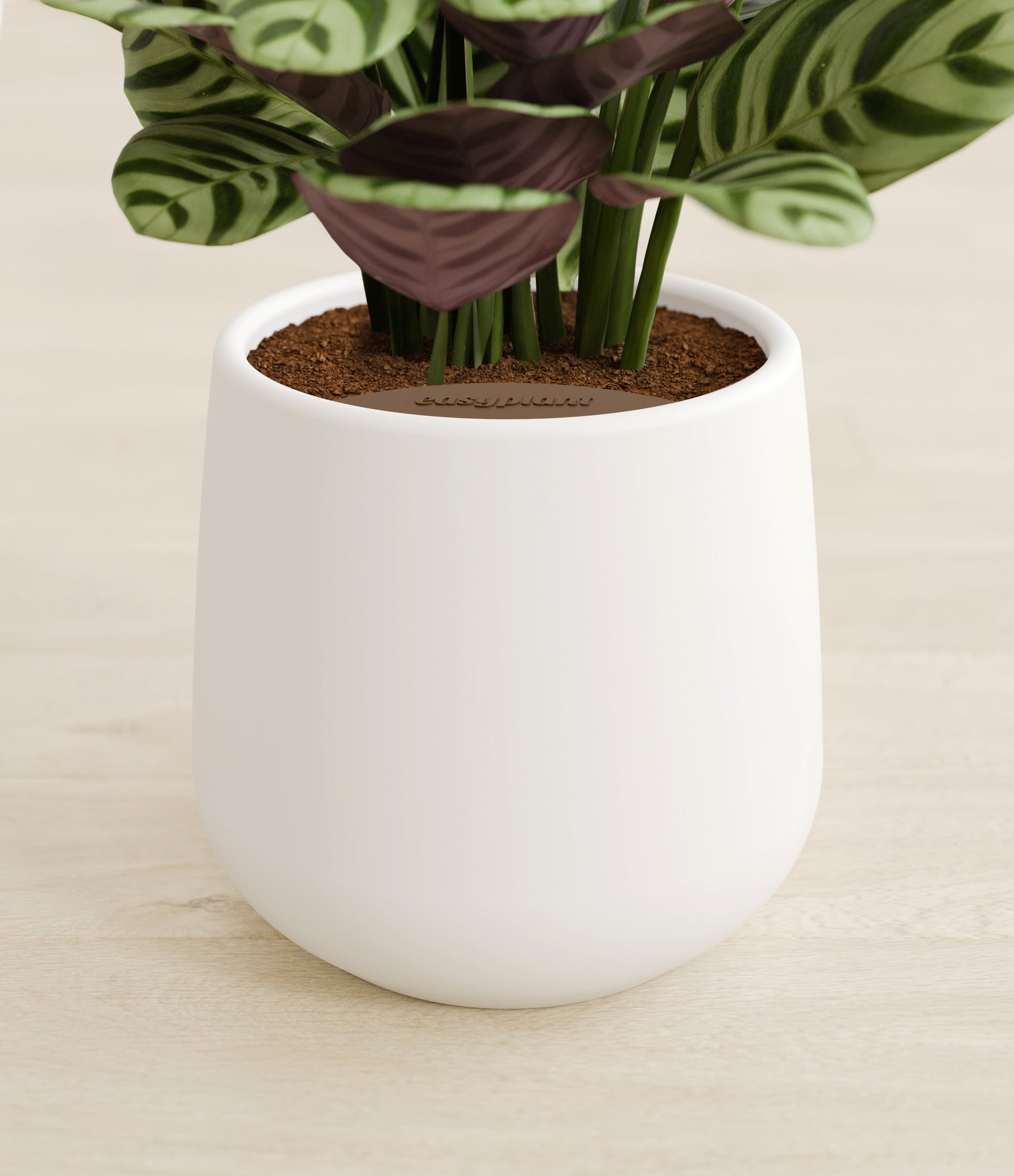 Native to the Amazonian jungles of South America, Calathea Burle Marxii features large, emblem-shaped leaves with bold strokes of forest green on top and deep burgundy underneath. This plant belongs to the Marantaceae family, also known as 'Prayer Plants'. These plants have a unique circadian rhythm, causing their leaves to move up at night and down during the day, in search of the sun, mimicking a wake-and-sleep cycle similar to humans.